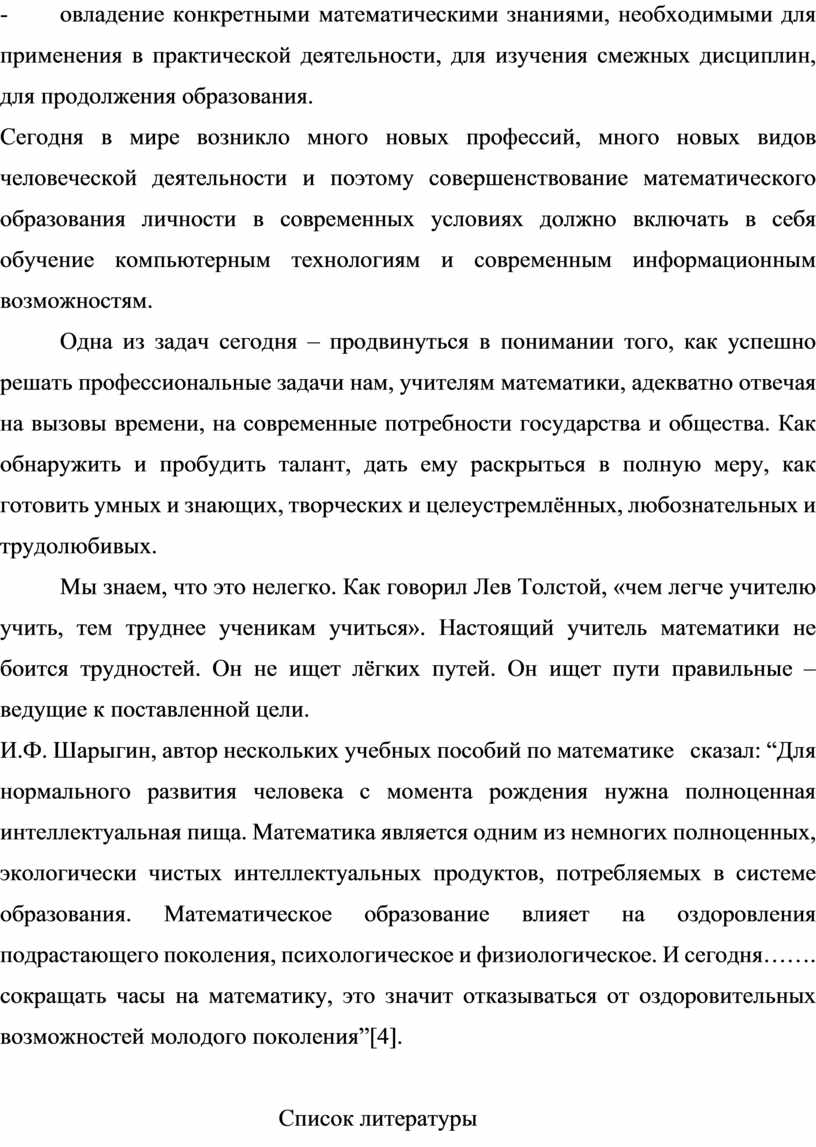 И.Ф. Шарыгин, автор нескольких учебных пособий по математике сказал: “Для нормального развития человека с момента рождения нужна полноценная интеллектуальная пища. Математика является одним из немногих полноценных, экологически чистых интеллектуальных продуктов, потребляемых в системе образования. Математическое образование влияет на оздоровления подрастающего поколения, психологическое и физиологическое. И сегодня……. сокращать часы на математику, это значит отказываться от оздоровительных возможностей молодого поколения”[4].