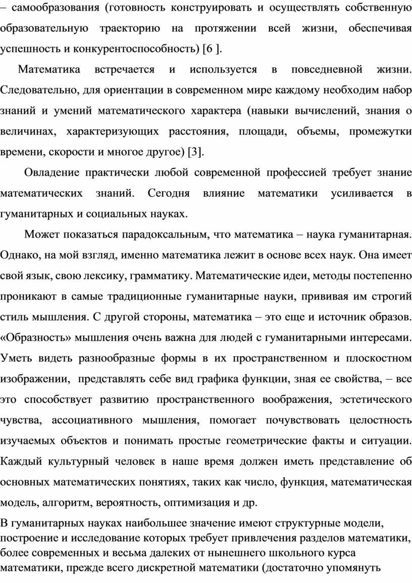 Может показаться парадоксальным, что математика – наука гуманитарная. Однако, на мой взгляд, именно математика лежит в основе всех наук. Она имеет свой язык, свою лексику, грамматику. Математические идеи, методы постепенно проникают в самые традиционные гуманитарные науки, прививая им строгий стиль мышления. С другой стороны, математика – это еще и источник образов. «Образность» мышления очень важна для людей с гуманитарными интересами. Уметь видеть разнообразные формы в их пространственном и плоскостном изображении, представлять себе вид графика функции, зная ее свойства, – все это способствует развитию пространственного воображения, эстетического чувства, ассоциативного мышления, помогает почувствовать целостность изучаемых объектов и понимать простые геометрические факты и ситуации. Каждый культурный человек в наше время должен иметь представление об основных математических понятиях, таких как число, функция, математическая модель, алгоритм, вероятность, оптимизация и др.
