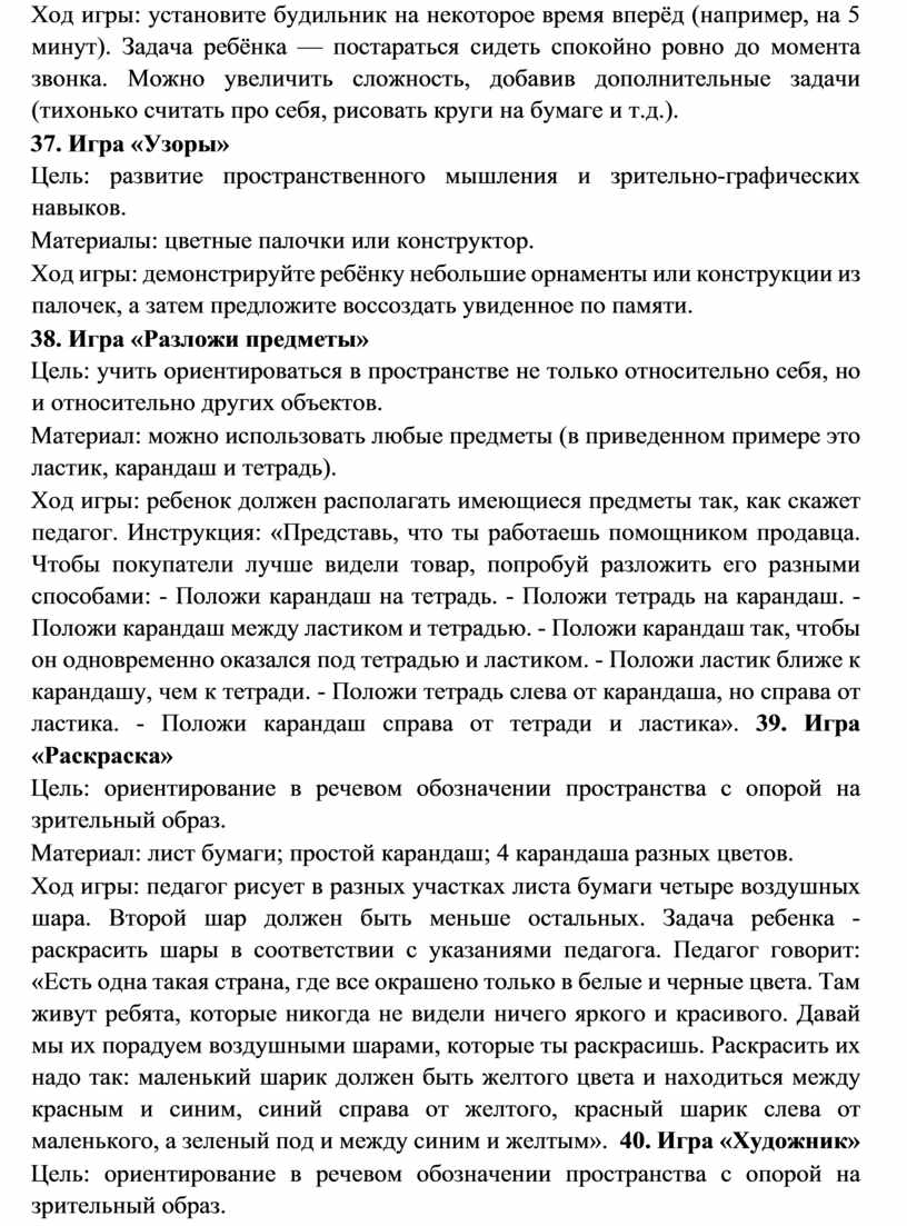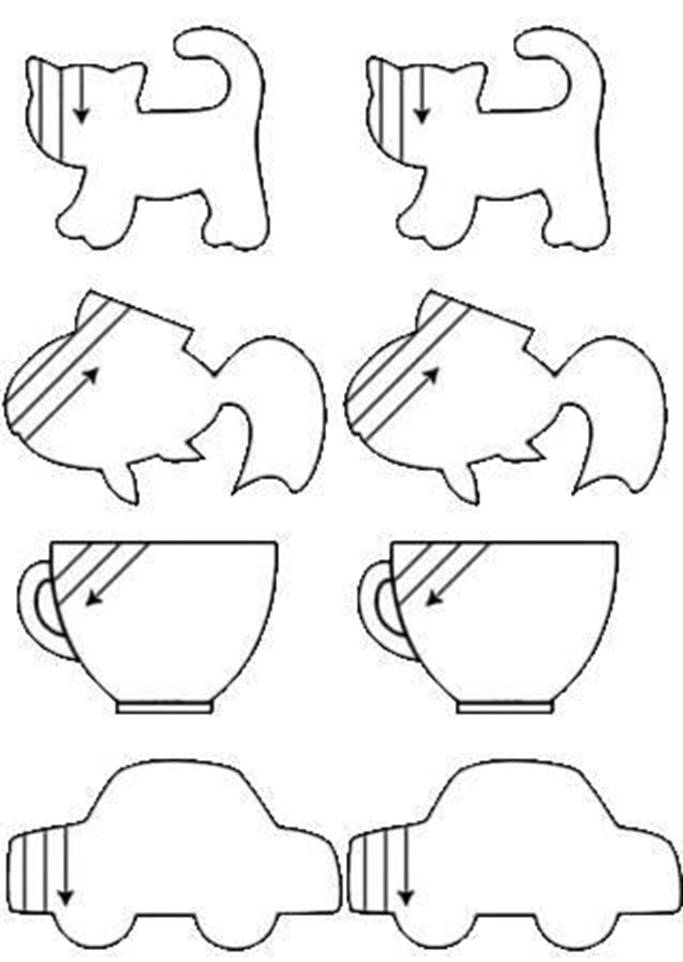Ход игры: ребенок должен располагать имеющиеся предметы так, как скажет педагог. Инструкция: «Представь, что ты работаешь помощником продавца. Чтобы покупатели лучше видели товар, попробуй разложить его разными способами: - Положи карандаш на тетрадь. - Положи тетрадь на карандаш. - Положи карандаш между ластиком и тетрадью. - Положи карандаш так, чтобы он одновременно оказался под тетрадью и ластиком. - Положи ластик ближе к карандашу, чем к тетради. - Положи тетрадь слева от карандаша, но справа от ластика. - Положи карандаш справа от тетради и ластика». 39. Игра «Раскраска»