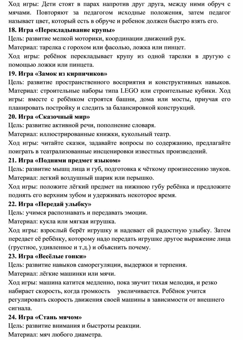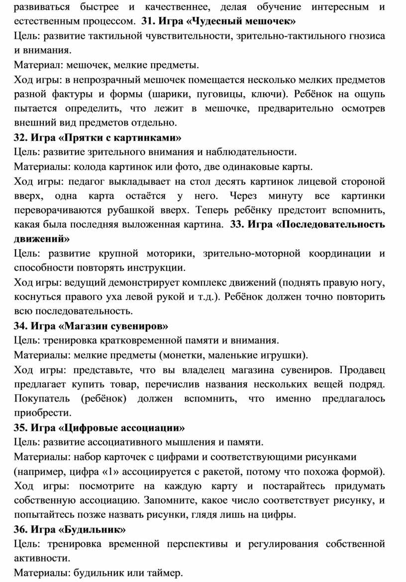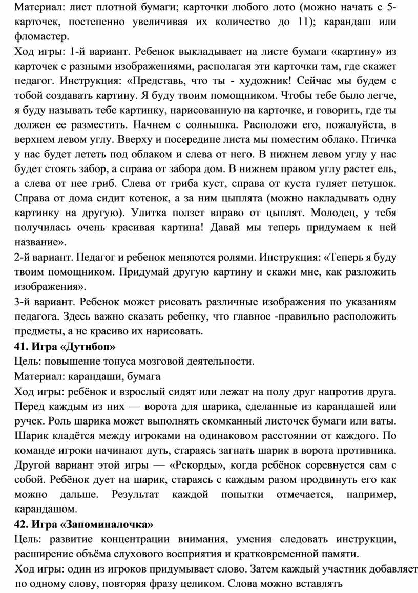 Ход игры: педагог выкладывает на стол десять картинок лицевой стороной вверх, одна карта остаётся у него. Через минуту все картинки переворачиваются рубашкой вверх. Теперь ребёнку предстоит вспомнить, какая была последняя выложенная картина. 33. Игра «Последовательность движений»