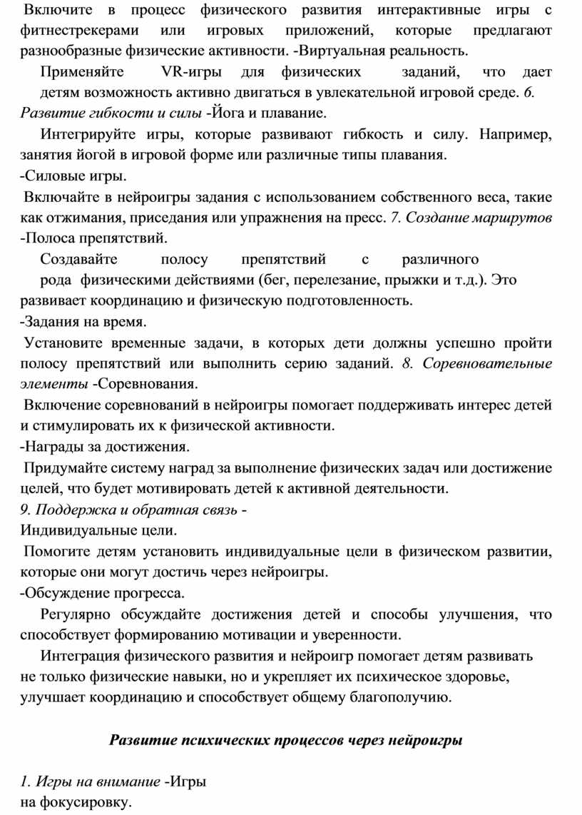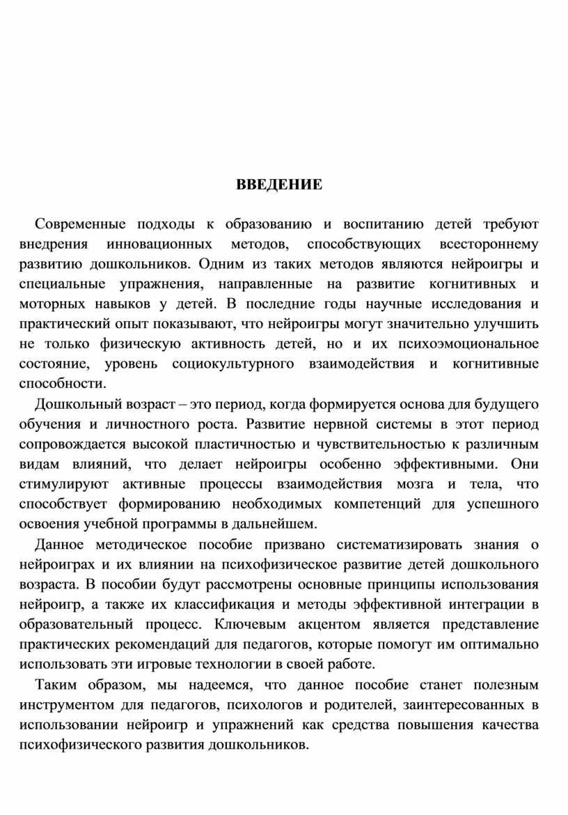 Настоящее методическое пособие представляет собой практическое руководство, посвященное изучению влияния нейроигр и специальных упражнений на психофизическое развитие детей дошкольного возраста. Рассматриваются теоретические основы особенности развития нервной системы ребенка, механизмы воздействия нейроигр и упражнений на когнитивные способности, эмоциональное состояние и физическое здоровье дошкольника. Приводятся практические рекомендации по организации и проведении нейроигр и комплексов упражнений, направленных на гармоничное развитие ребенка.