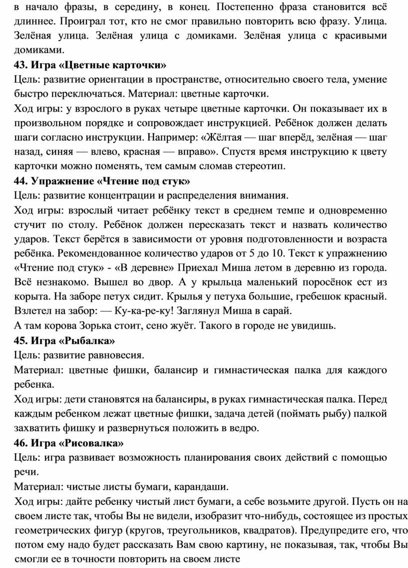 Ход игры: взрослый читает ребёнку текст в среднем темпе и одновременно стучит по столу. Ребёнок должен пересказать текст и назвать количество ударов. Текст берётся в зависимости от уровня подготовленности и возраста ребёнка. Рекомендованное количество ударов от 5 до 10. Текст к упражнению «Чтение под стук» - «В деревне» Приехал Миша летом в деревню из города. Всё незнакомо. Вышел во двор. А у крыльца маленький поросёнок ест из корыта. На заборе петух сидит. Крылья у петуха большие, гребешок красный. Взлетел на забор: — Ку-ка-ре-ку! Заглянул Миша в сарай.