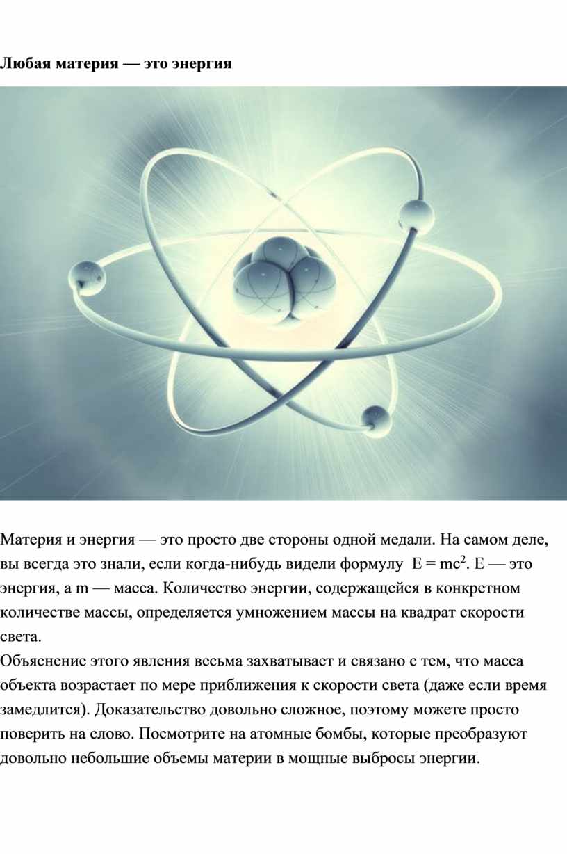 Материя и энергия — это просто две стороны одной медали. На самом деле, вы всегда это знали, если когда-нибудь видели формулу E = mc2. E — это энергия, а m — масса. Количество энергии, содержащейся в конкретном количестве массы, определяется умножением массы на квадрат скорости света.