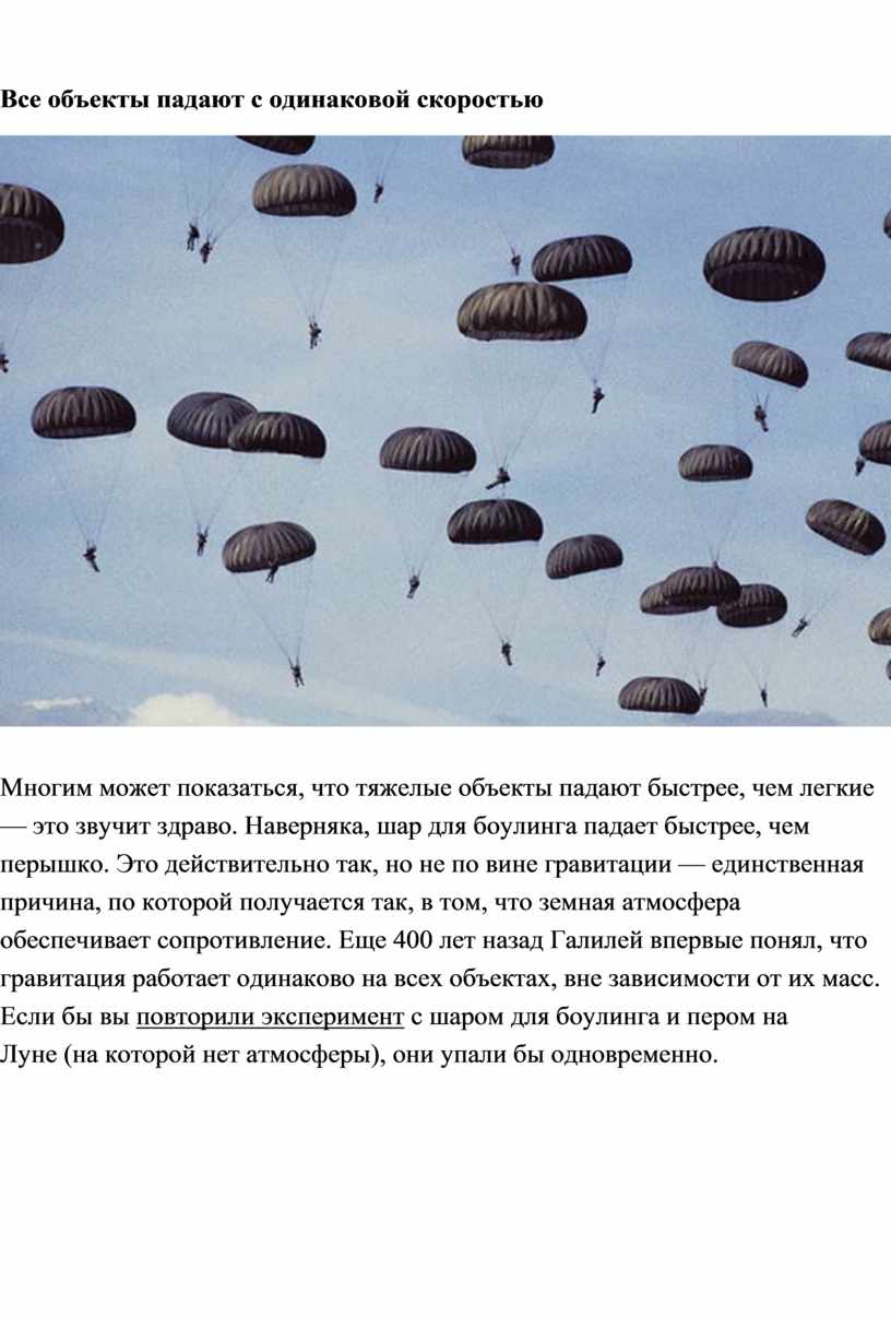 Многим может показаться, что тяжелые объекты падают быстрее, чем легкие — это звучит здраво. Наверняка, шар для боулинга падает быстрее, чем перышко. Это действительно так, но не по вине гравитации — единственная причина, по которой получается так, в том, что земная атмосфера обеспечивает сопротивление. Еще 400 лет назад Галилей впервые понял, что гравитация работает одинаково на всех объектах, вне зависимости от их масс. Если бы вы повторили эксперимент с шаром для боулинга и пером на Луне (на которой нет атмосферы), они упали бы одновременно.