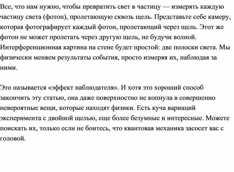 Это называется «эффект наблюдателя». И хотя это хороший способ закончить эту статью, она даже поверхностно не копнула в совершенно невероятные вещи, которые находят физики. Есть куча вариаций эксперимента с двойной щелью, еще более безумные и интересные. Можете поискать их, только если не боитесь, что квантовая механика засосет вас с головой.