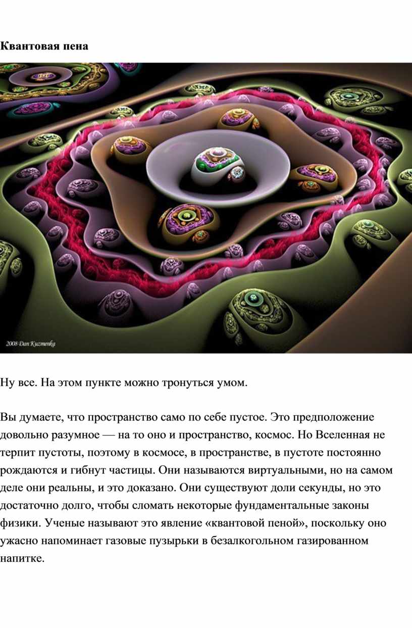 Вы думаете, что пространство само по себе пустое. Это предположение довольно разумное — на то оно и пространство, космос. Но Вселенная не терпит пустоты, поэтому в космосе, в пространстве, в пустоте постоянно рождаются и гибнут частицы. Они называются виртуальными, но на самом деле они реальны, и это доказано. Они существуют доли секунды, но это достаточно долго, чтобы сломать некоторые фундаментальные законы физики. Ученые называют это явление «квантовой пеной», поскольку оно ужасно напоминает газовые пузырьки в безалкогольном газированном напитке.