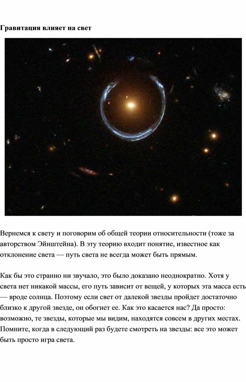 Как бы это странно ни звучало, это было доказано неоднократно. Хотя у света нет никакой массы, его путь зависит от вещей, у которых эта масса есть — вроде солнца. Поэтому если свет от далекой звезды пройдет достаточно близко к другой звезде, он обогнет ее. Как это касается нас? Да просто: возможно, те звезды, которые мы видим, находятся совсем в других местах. Помните, когда в следующий раз будете смотреть на звезды: все это может быть просто игра света.