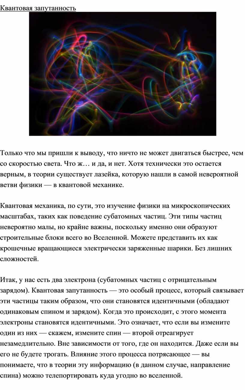 Итак, у нас есть два электрона (субатомных частиц с отрицательным зарядом). Квантовая запутанность — это особый процесс, который связывает эти частицы таким образом, что они становятся идентичными (обладают одинаковым спином и зарядом). Когда это происходит, с этого момента электроны становятся идентичными. Это означает, что если вы измените один из них — скажем, измените спин — второй отреагирует незамедлительно. Вне зависимости от того, где он находится. Даже если вы его не будете трогать. Влияние этого процесса потрясающее — вы понимаете, что в теории эту информацию (в данном случае, направление спина) можно телепортировать куда угодно во вселенной.