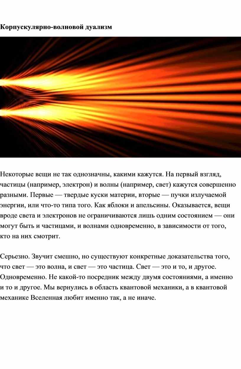 Серьезно. Звучит смешно, но существуют конкретные доказательства того, что свет — это волна, и свет — это частица. Свет — это и то, и другое. Одновременно. Не какой-то посредник между двумя состояниями, а именно и то и другое. Мы вернулись в область квантовой механики, а в квантовой механике Вселенная любит именно так, а не иначе.