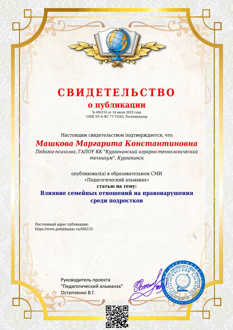 СПРАВКА № 494155 О ПРИНЯТИИ МАТЕРИАЛА К ПУБЛИКАЦИИ