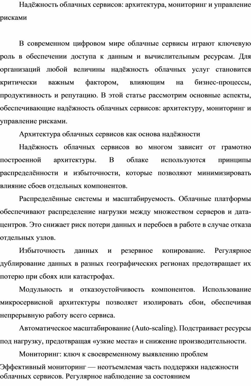 Надёжность облачных сервисов: архитектура, мониторинг и управление рисками
