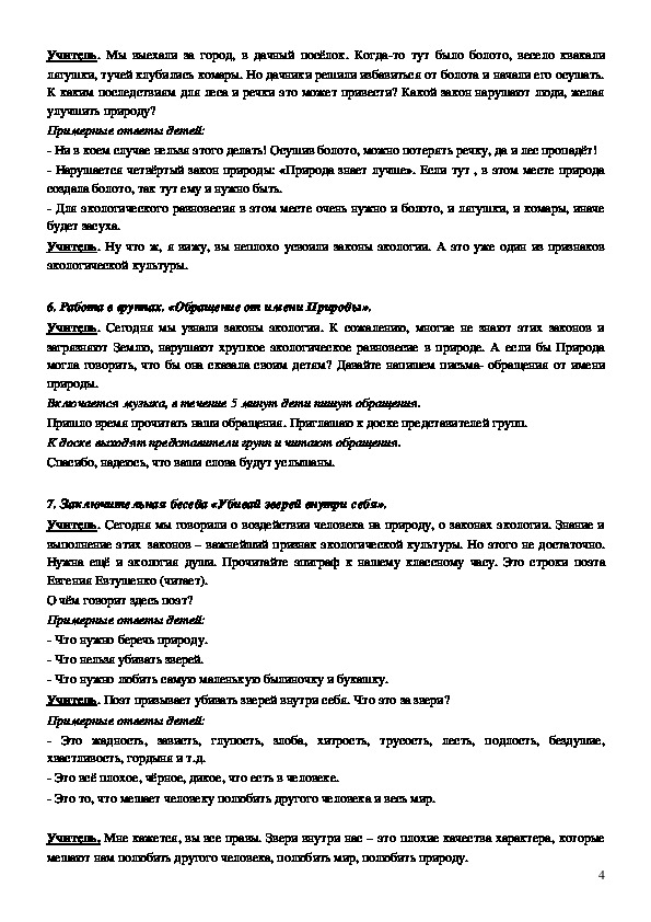 Учитель. Сегодня мы говорили о воздействии человека на природу, о законах экологии. Знание и