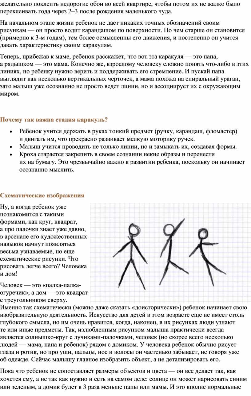На начальном этапе жизни ребенок не дает никаких точных обозначений своим рисункам — он просто водит карандашом по поверхности. Но чем старше он становится (примерно к 3-м годам), тем более осмысленны его движения, и постепенно он учится давать характеристику своим каракулям.