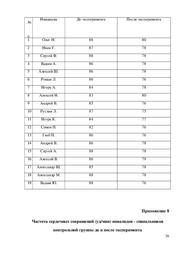 Частота сердечных сокращений (уд/мин) инвалидов спинальников