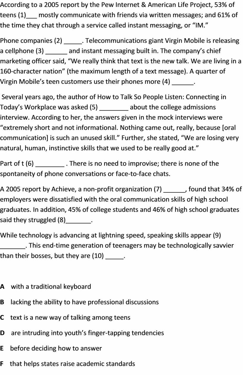 A 2005 report by Achieve, a non-profit organization (7) ______, found that 34% of employers were dissatisfied with the oral communication skills of high school graduates. In addition, 45% of college students and 46% of high school graduates said they struggled (8)_______.