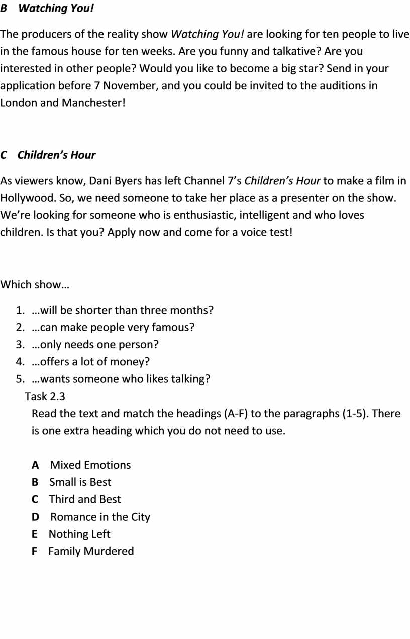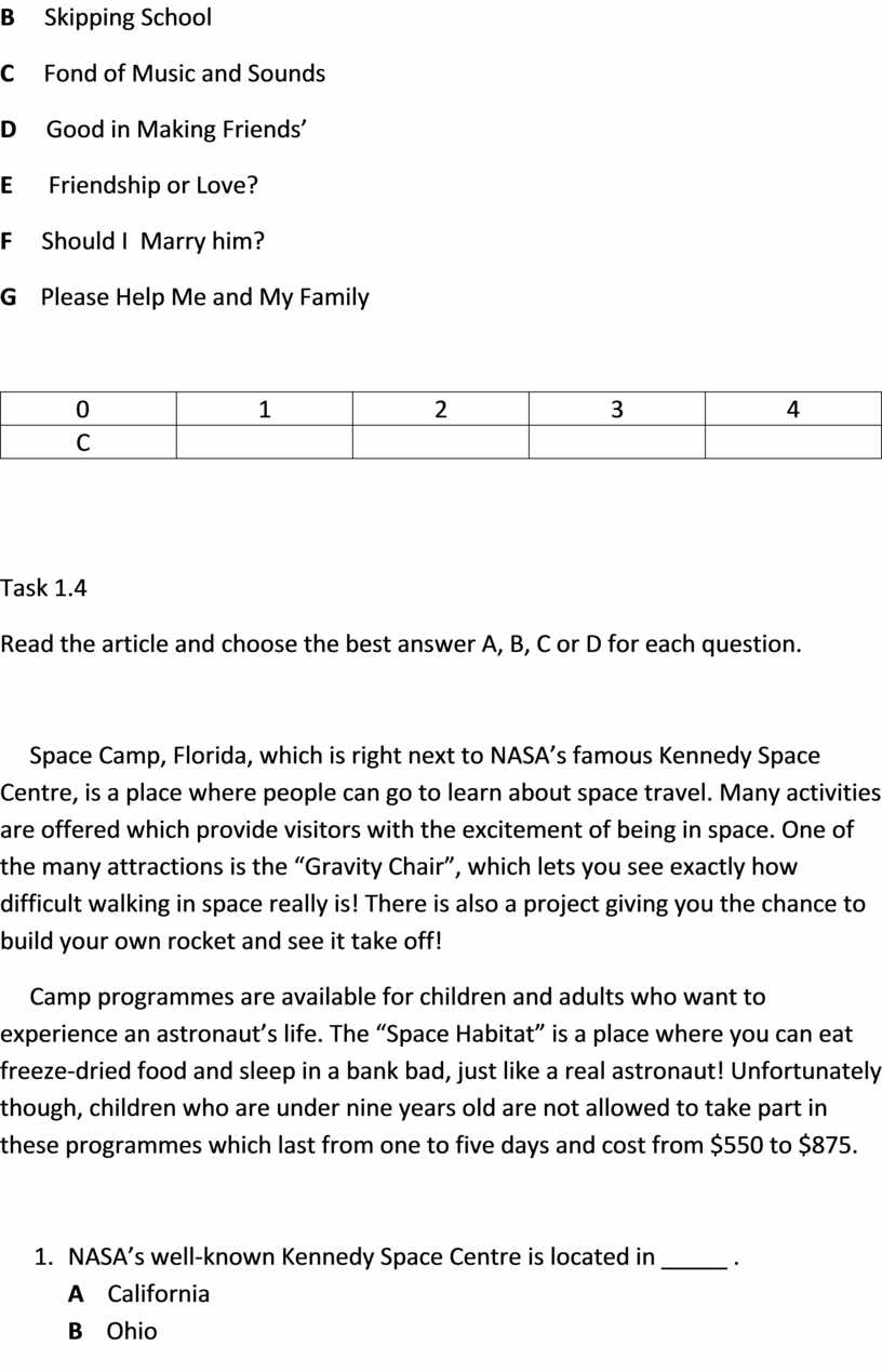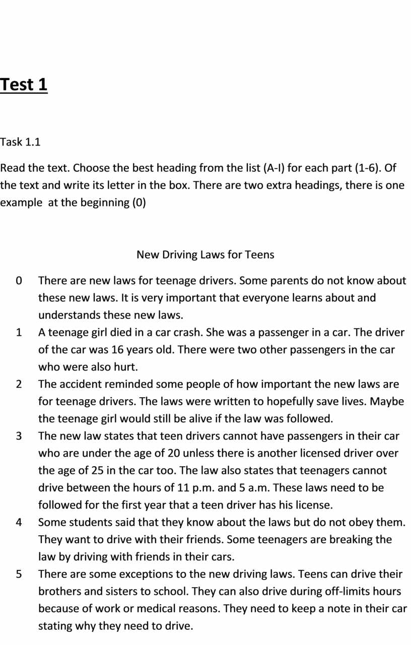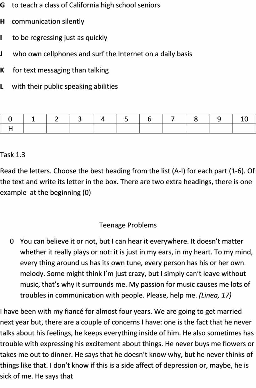 Read the letters. Choose the best heading from the list (A-I) for each part (1-6). Of the text and write its letter in the box. There are two extra headings, there is one example at the beginning (0)