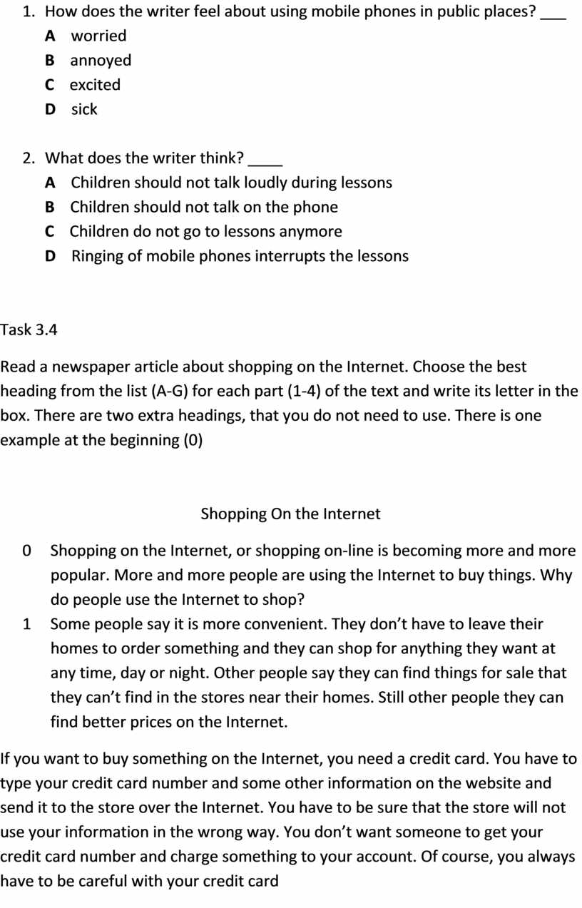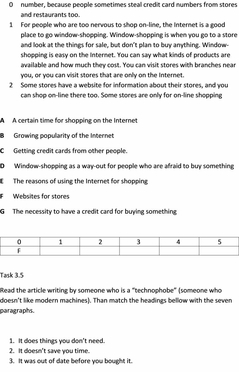 Read a newspaper article about shopping on the Internet. Choose the best heading from the list (A-G) for each part (1-4) of the text and write its letter in the box. There are two extra headings, that you do not need to use. There is one example at the beginning (0)