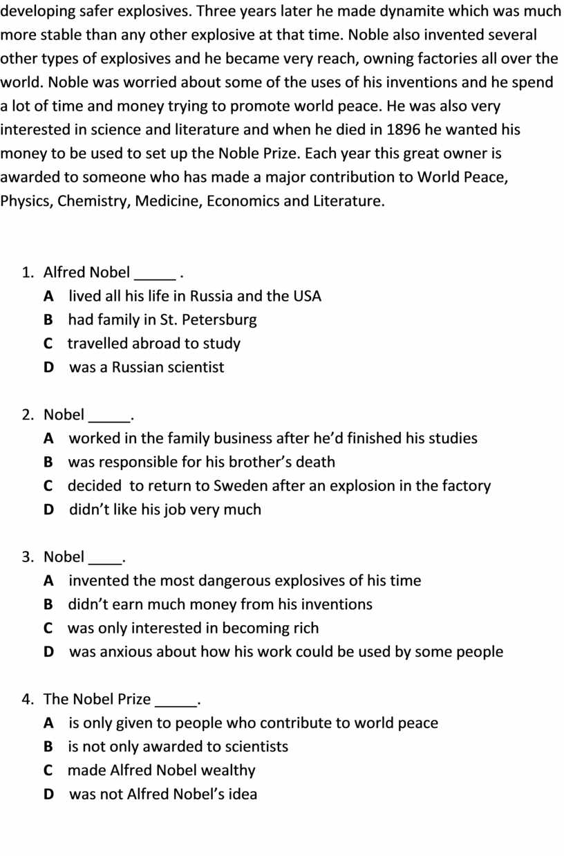 Noble was born in 1833 in Stockholm and studied in St. Petersburg, Russia and in the USA. When he returned home, he worked in his father’s factory developing weapons and explosives. In 1864, Alfred’s younger brother and four other people were killed in an explosion in the factory. After this Alfred dedicated his life to developing safer explosives. Three years later he made dynamite which was much more stable than any other explosive at that time. Noble also invented several other types of explosives and he became very reach, owning factories all over the world. Noble was worried about some of the uses of his inventions and he spend a lot of time and money trying to promote world peace. He was also very interested in science and literature and when he died in 1896 he wanted his money to be used to set up the Noble Prize. Each year this great owner is awarded to someone who has made a major contribution to World Peace, Physics, Chemistry, Medicine, Economics and Literature.