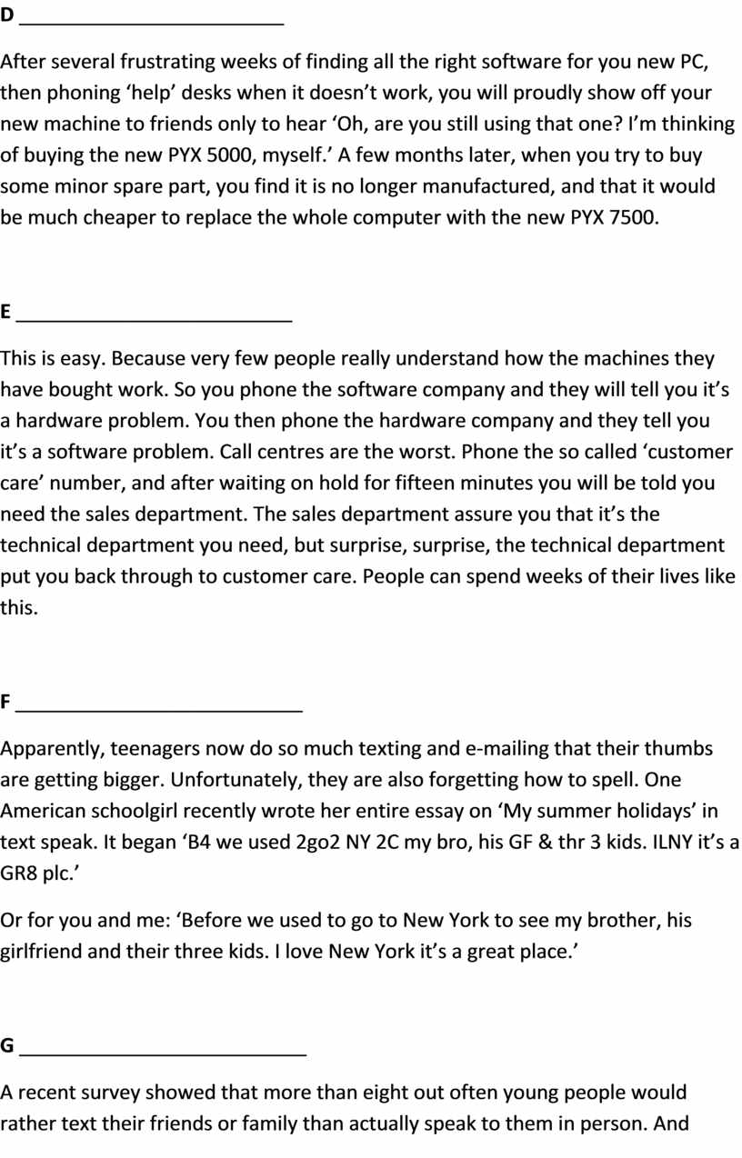 Read the article writing by someone who is a “technophobe” (someone who doesn’t like modern machines). Than match the headings bellow with the seven paragraphs.
