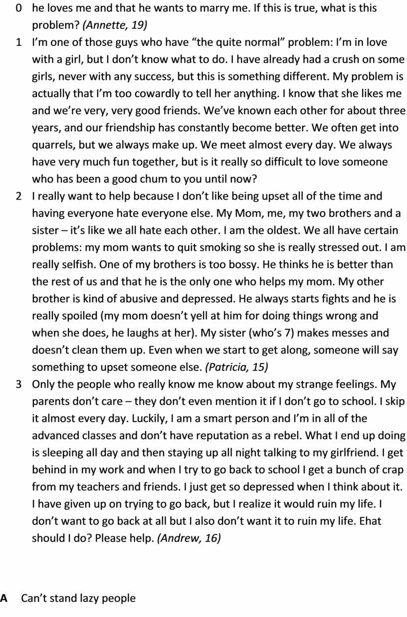 3 I really want to help because I don’t like being upset all of the time and having everyone hate everyone else. My Mom, me, my two brothers and a sister – it’s like we all hate each other. I am the oldest. We all have certain problems: my mom wants to quit smoking so she is really stressed out. I am really selfish. One of my brothers is too bossy. He thinks he is better than the rest of us and that he is the only one who helps my mom. My other brother is kind of abusive and depressed. He always starts fights and he is really spoiled (my mom doesn’t yell at him for doing things wrong and when she does, he laughs at her). My sister (who’s 7) makes messes and doesn’t clean them up. Even when we start to get along, someone will say something to upset someone else. (Patricia, 15)