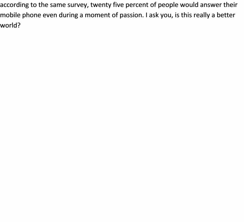 A recent survey showed that more than eight out often young people would rather text their friends or family than actually speak to them in person. And according to the same survey, twenty five percent of people would answer their mobile phone even during a moment of passion. I ask you, is this really a better world?