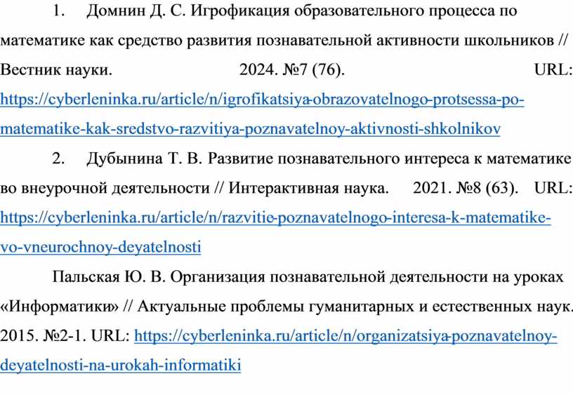 2. Домнин Д. С. Игрофикация образовательного процесса по математике как средство развития познавательной активности школьников // Вестник науки. 2024. №7 (76). URL: https://cyberleninka.ru/article/n/igrofikatsiya-obrazovatelnogo-protsessa-po-matematike-kak-sredstvo-razvitiya-poznavatelnoy-aktivnosti-shkolnikov