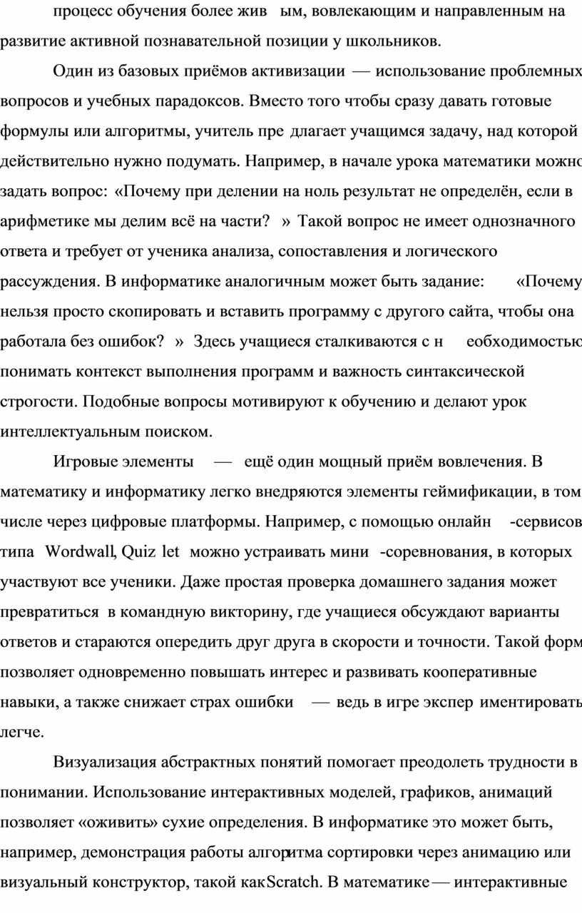 В условиях обновления образовательной парадигмы и перехода к деятельностному подходу перед учителем стоит задача не просто передать знания, а пробудить у учащихся интерес к учебному процессу, сделать обучение осознанным и увлекательным. Особенно это актуально в преподавании таких дисциплин, как математика и информатика, где высока доля абстрактного материала и алгоритмических действий. Цель настоящей статьи — рассмотреть методические приёмы, которые позволяют сделать процесс обучения более живым, вовлекающим и направленным на развитие активной познавательной позиции у школьников.