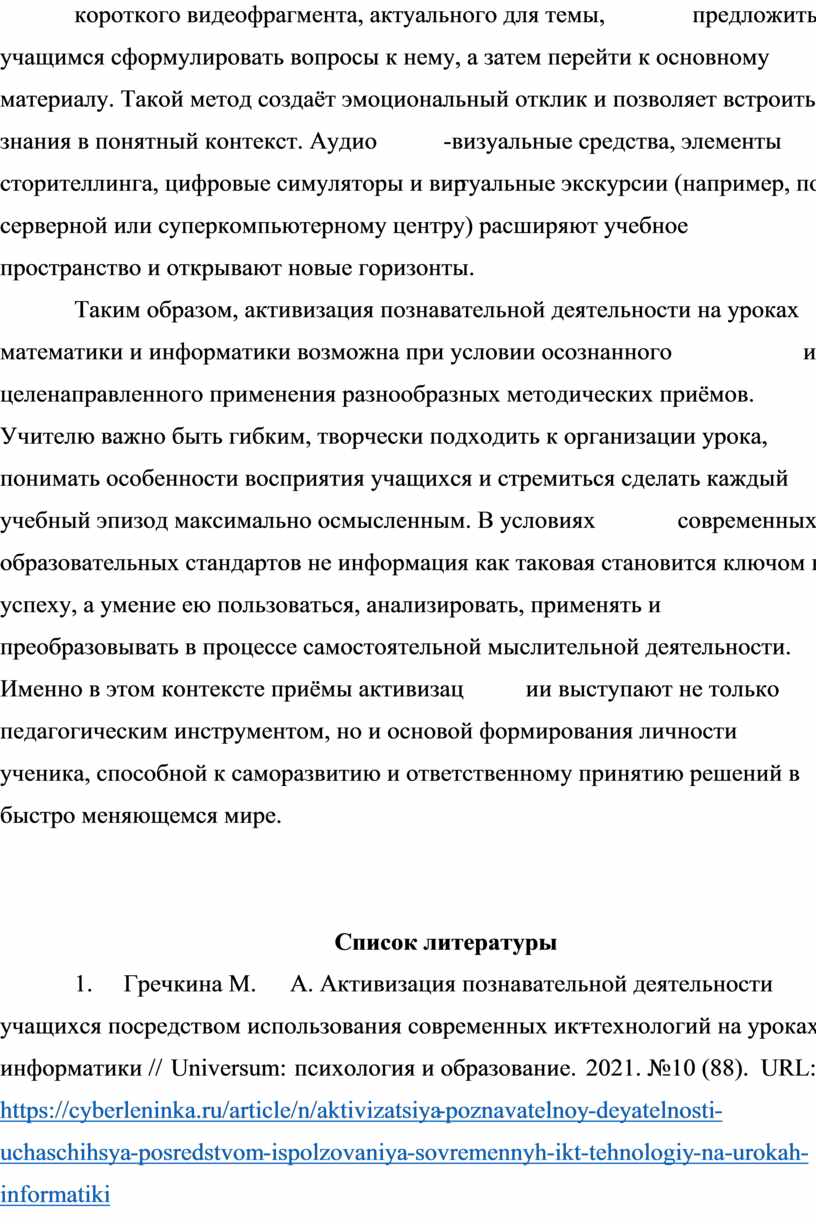 1. Гречкина М. А. Активизация познавательной деятельности учащихся посредством использования современных икт-технологий на уроках информатики // Universum: психология и образование. 2021. №10 (88). URL: https://cyberleninka.ru/article/n/aktivizatsiya-poznavatelnoy-deyatelnosti-uchaschihsya-posredstvom-ispolzovaniya-sovremennyh-ikt-tehnologiy-na-urokah-informatiki