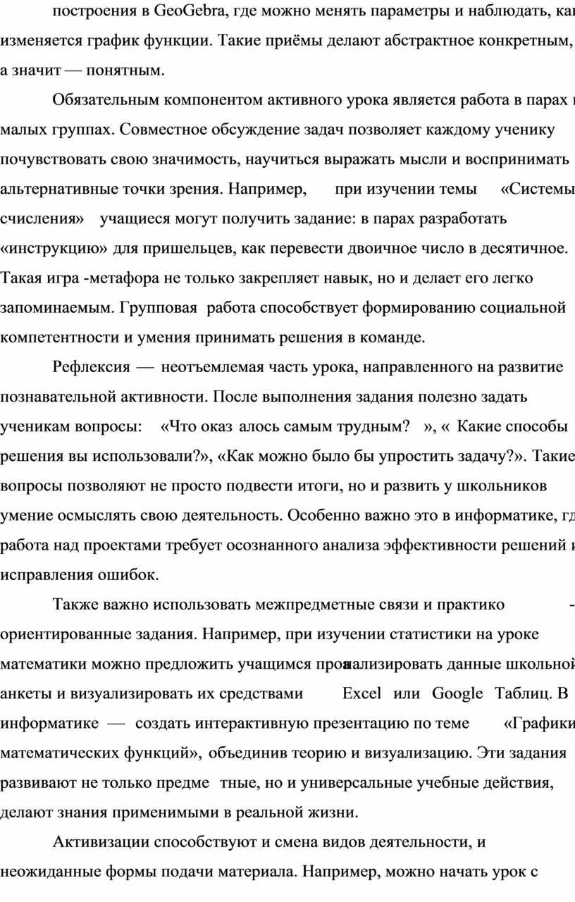 Обязательным компонентом активного урока является работа в парах и малых группах. Совместное обсуждение задач позволяет каждому ученику почувствовать свою значимость, научиться выражать мысли и воспринимать альтернативные точки зрения. Например, при изучении темы «Системы счисления» учащиеся могут получить задание: в парах разработать «инструкцию» для пришельцев, как перевести двоичное число в десятичное. Такая игра-метафора не только закрепляет навык, но и делает его легко запоминаемым. Групповая работа способствует формированию социальной компетентности и умения принимать решения в команде.
