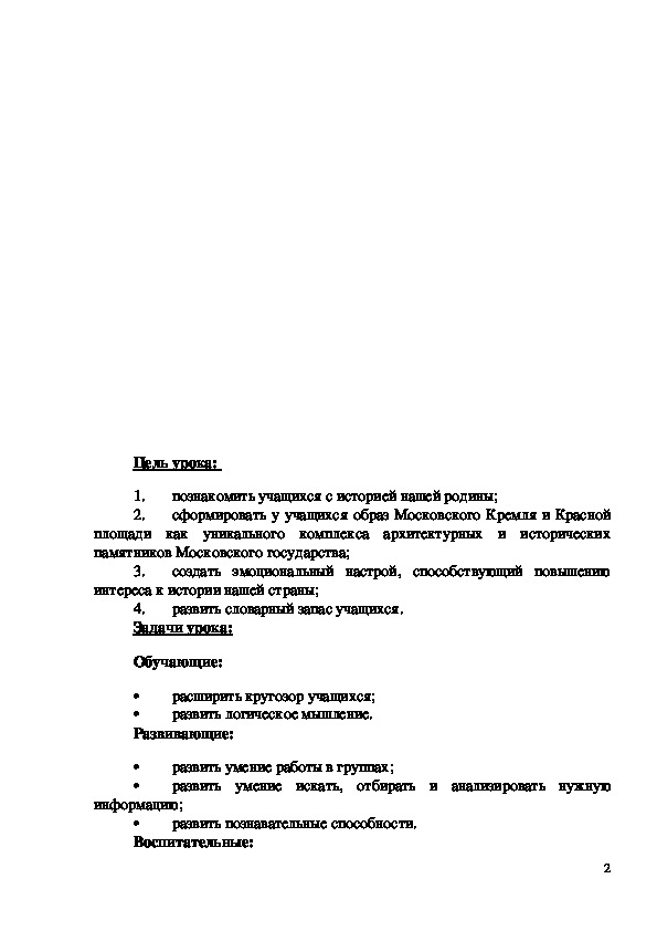 2. сформировать у учащихся образ Московского Кремля и Красной площади как уникального комплекса архитектурных и исторических памятников Московского государства;
