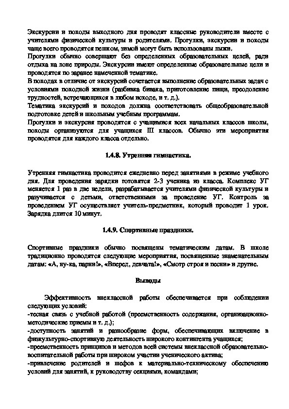 1.4.7. Экскурсии и походы.Экскурсии и походы выходного дня проводят классные руководители вместе с