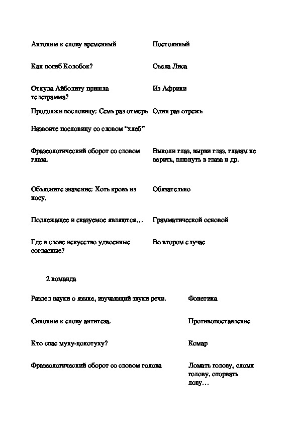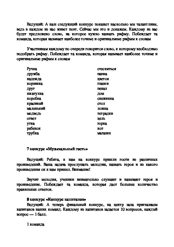 подобрать рифму. Побеждает та команда, которая называет наиболее точные и