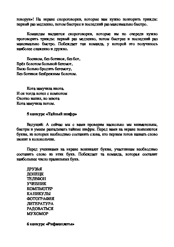 6 конкурс «Рифмоплеты»Ведущий: А наш следующий конкурс покажет насколько мы талантливы,