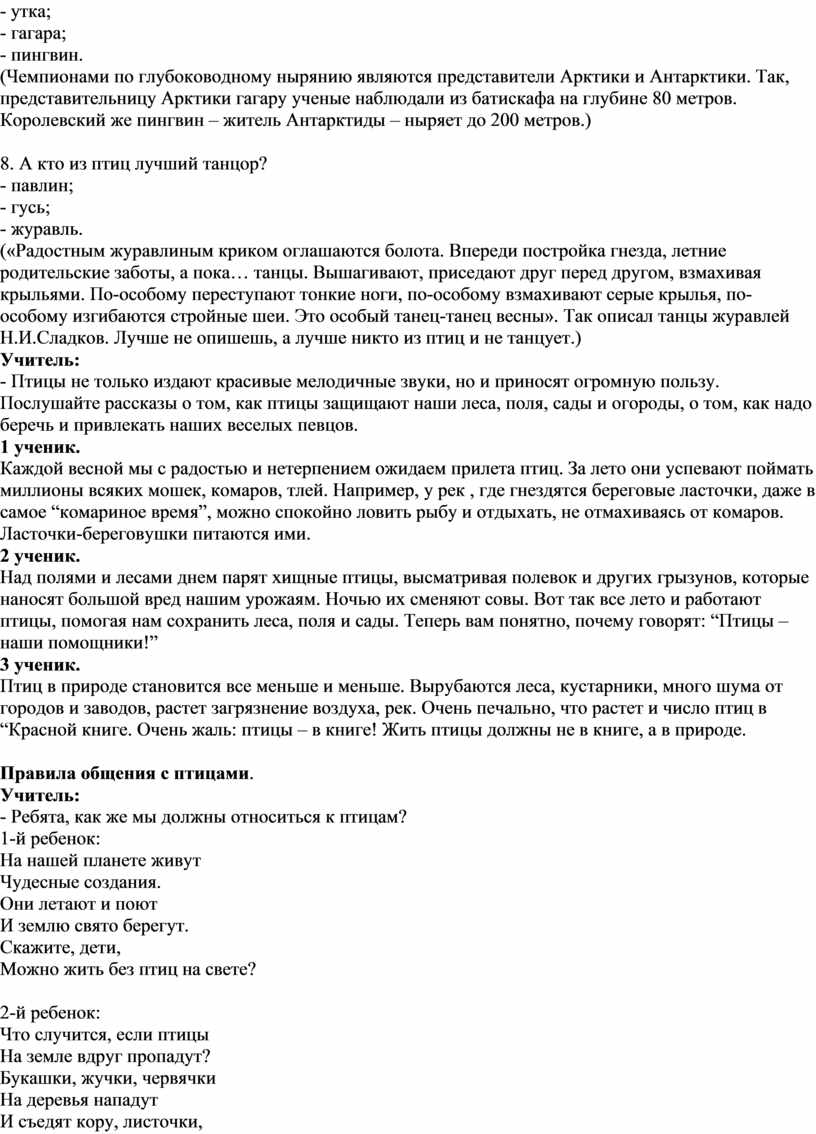 Учитель: Давайте, ребята, так относиться к птицам, чтобы они нас не пугались, чтобы звонкие песни их радовали наш слух всегда. Они, так же как и все мы, нуждаются в заботе и внимании.