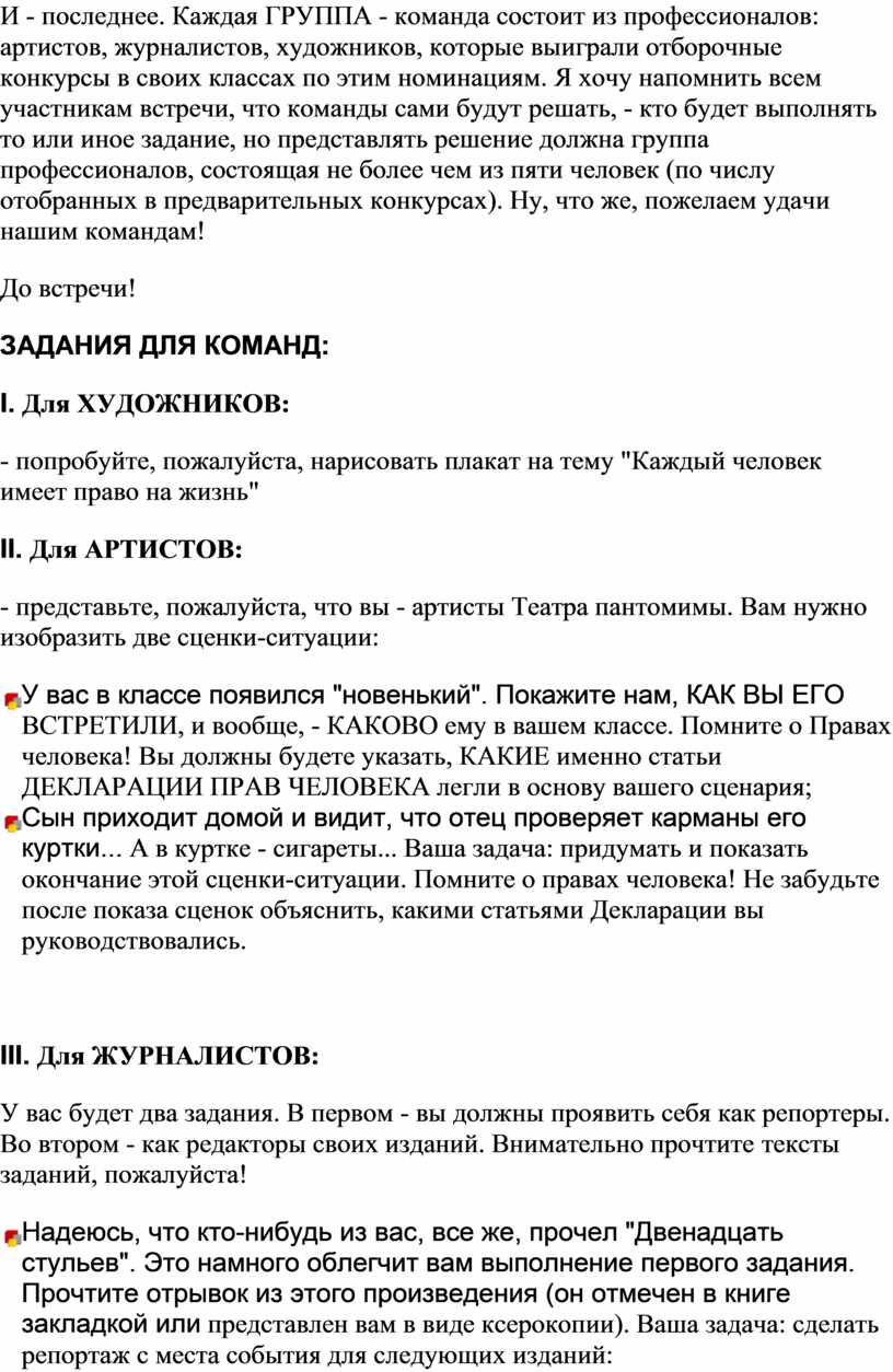 И - последнее. Каждая ГРУППА - команда состоит из профессионалов: артистов, журналистов, художников, которые выиграли отборочные конкурсы в своих классах по этим номинациям. Я хочу напомнить всем участникам встречи, что команды сами будут решать, - кто будет выполнять то или иное задание, но представлять решение должна группа профессионалов, состоящая не более чем из пяти человек (по числу отобранных в предварительных конкурсах). Ну, что же, пожелаем удачи нашим командам!