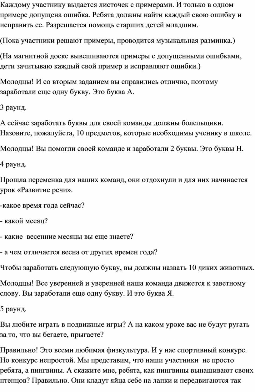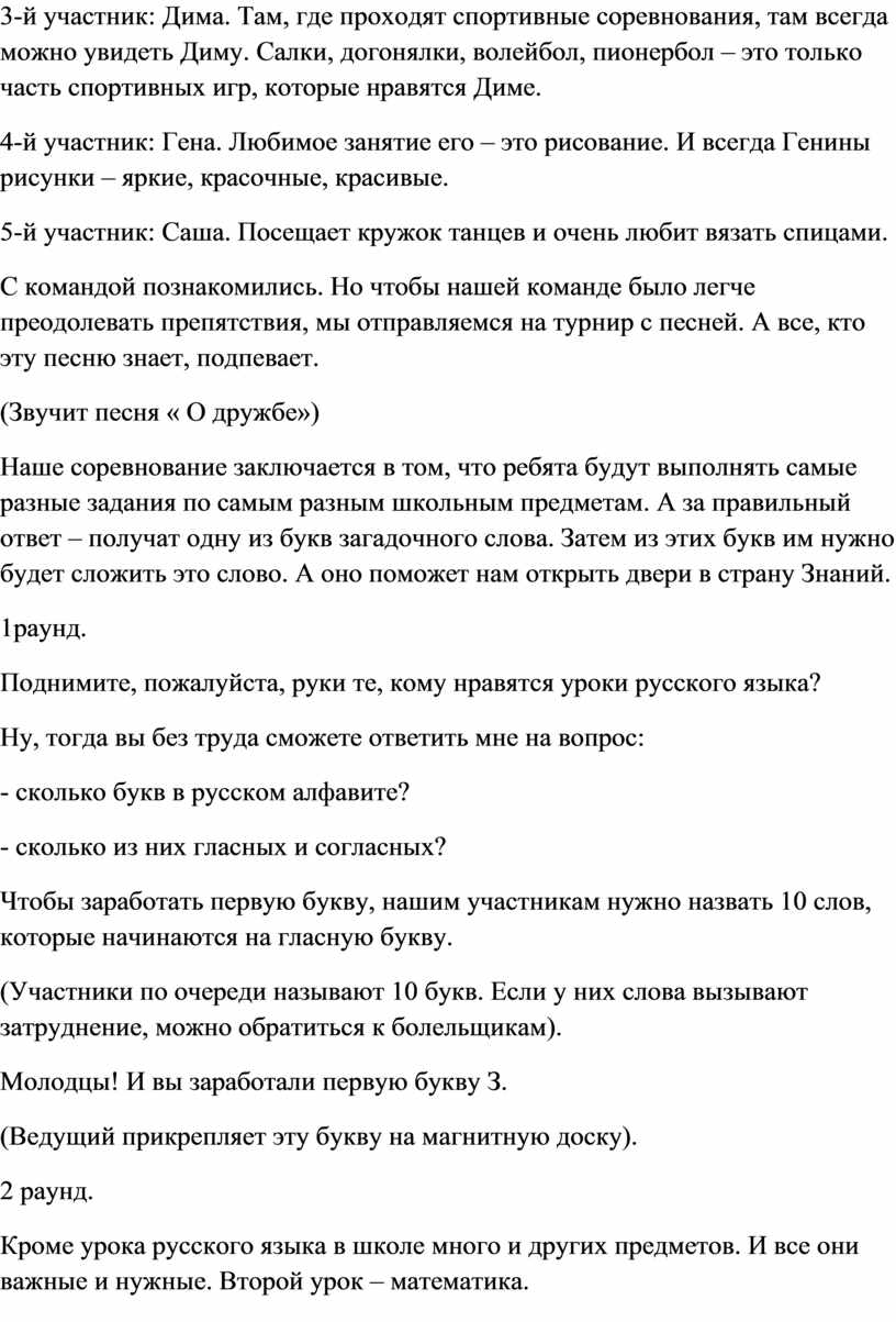 Наше соревнование заключается в том, что ребята будут выполнять самые разные задания по самым разным школьным предметам. А за правильный ответ – получат одну из букв загадочного слова. Затем из этих букв им нужно будет сложить это слово. А оно поможет нам открыть двери в страну Знаний.
