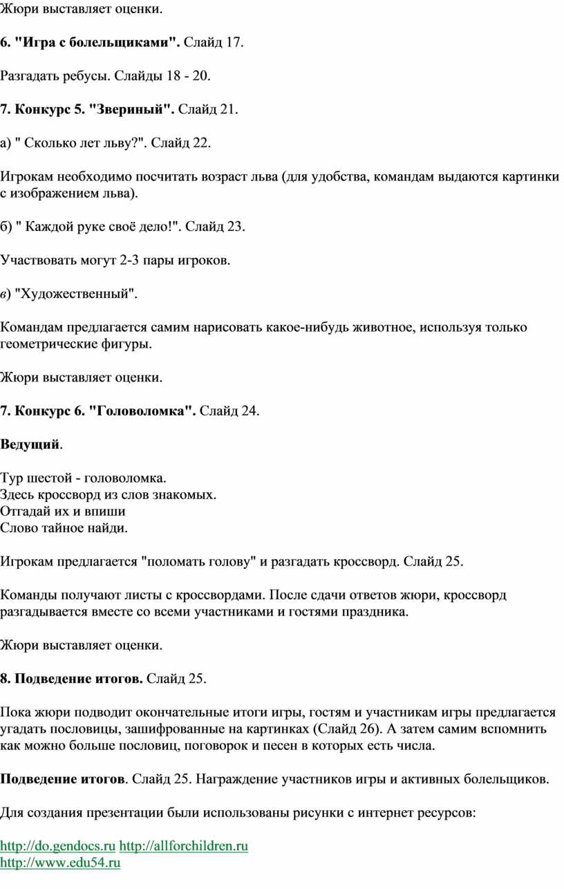 Пока жюри подводит окончательные итоги игры, гостям и участникам игры предлагается угадать пословицы, зашифрованные на картинках (Слайд 26). А затем самим вспомнить как можно больше пословиц, поговорок и песен в которых есть числа.