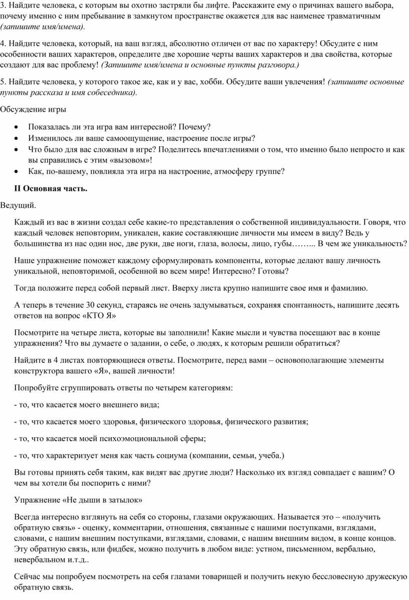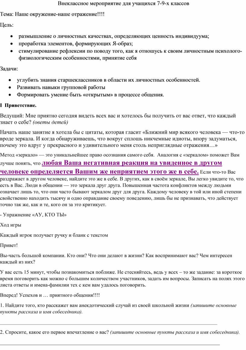Ребята сегодня на занятие мы с вами проделали несколько упражнений, которые помогли лучше понять друг друга, а в первую очередь познать себя через свое мнения и мнения окружающих. Как бы каждый из вас увидел себя в отражениях других представителей группы. На данном занятие каждый из вас как бы помог друг другу познать себя. Возможно сейчас у вас есть какие-то вопросы, кто-то из вас возможно сомневается в своих выводах. С этими вопросами вы можете обратится ко мне, в любое удобное время и получить обратную связь от меня. А сейчас хотелось обсудить как вы воспринимали себя, видя свое «отражение» в «живом зеркале»? Какие особенности поведения, характера, внешности товарищей бросались в глаза при показе, какие – стали неожиданным открытием? Давайте называть имена мы не будем, а лишь выскажемся. Если есть желание, ответьте на вопрос – «Как это про вас? Есть ли какие-то сходства между вами»