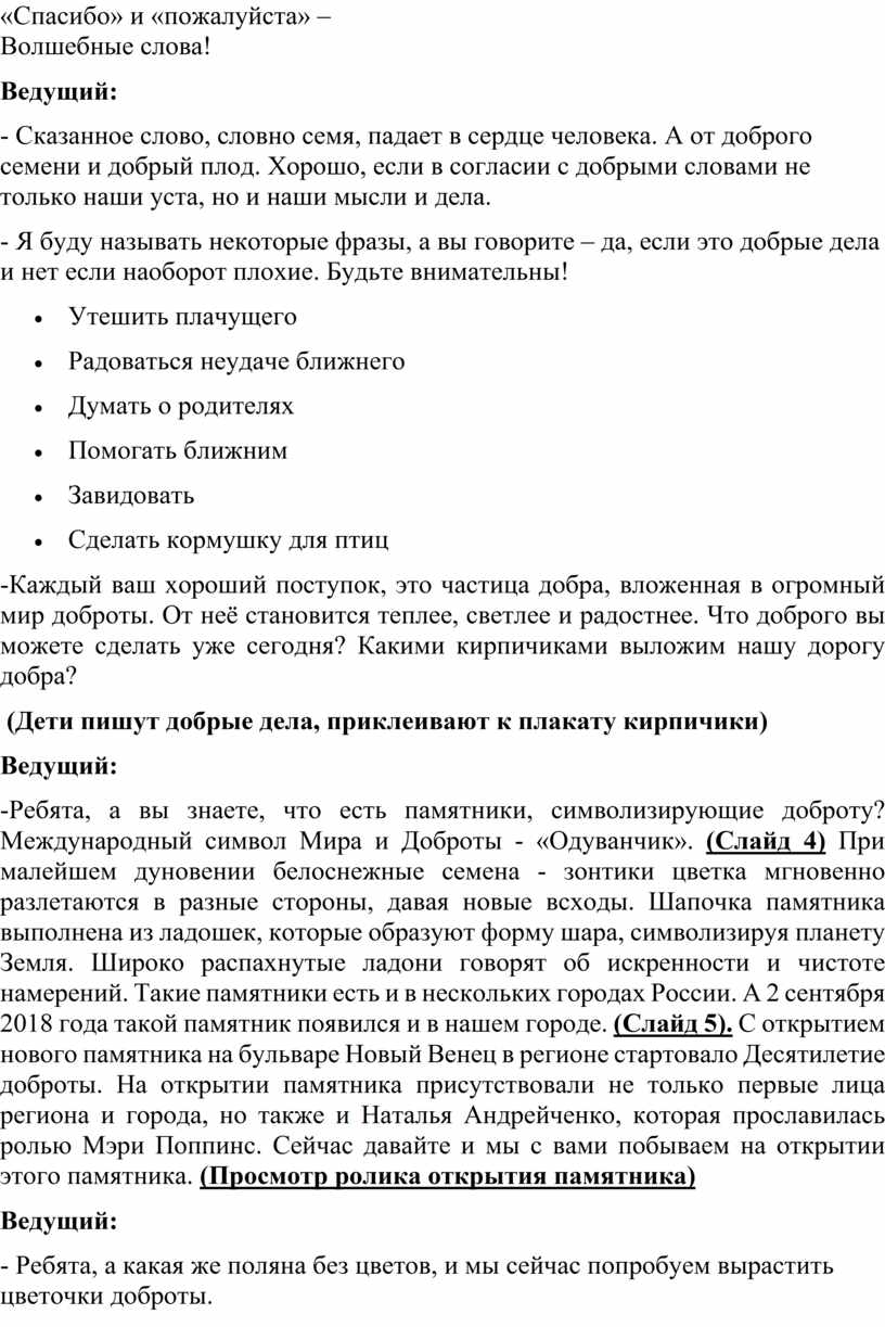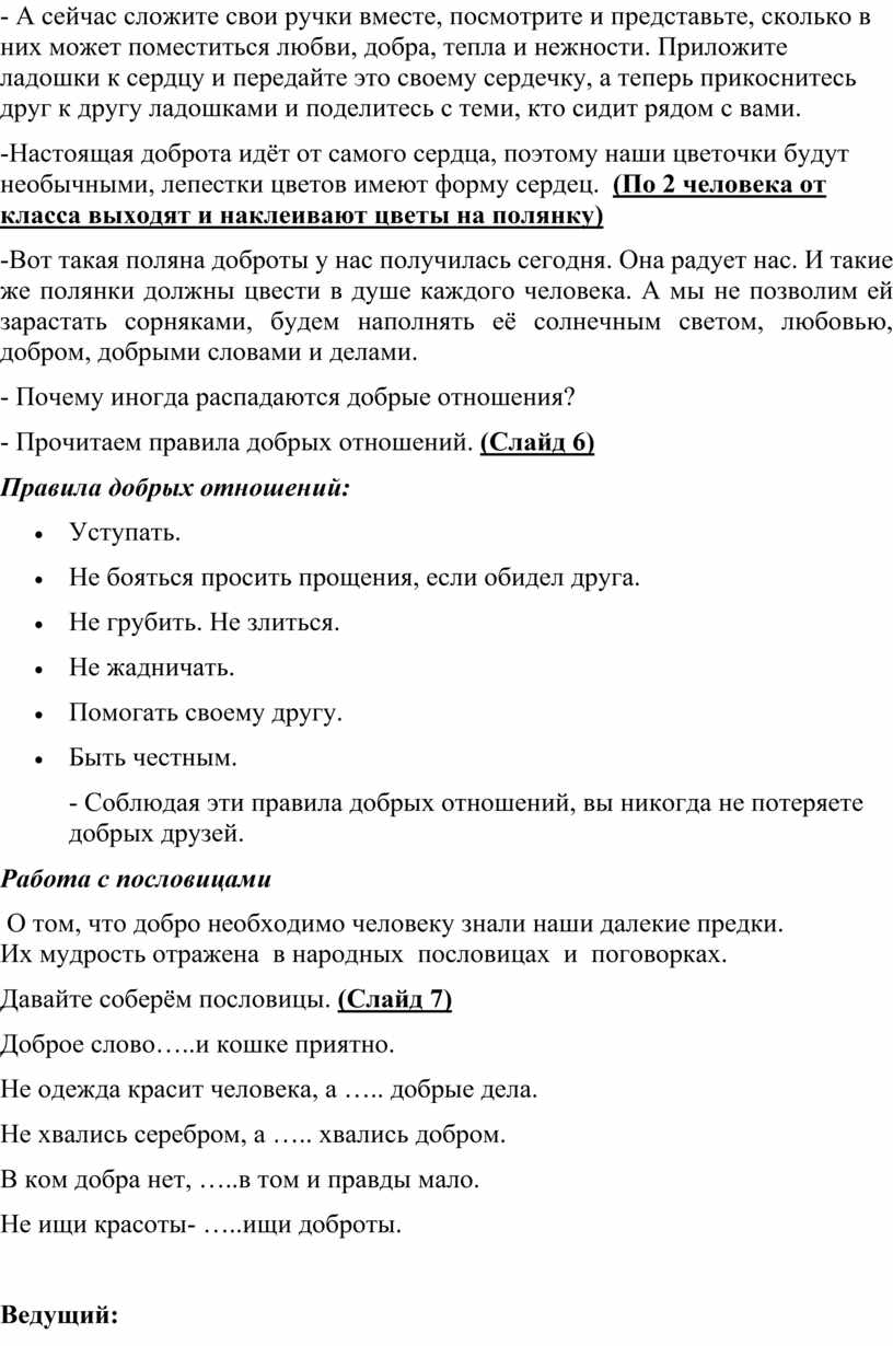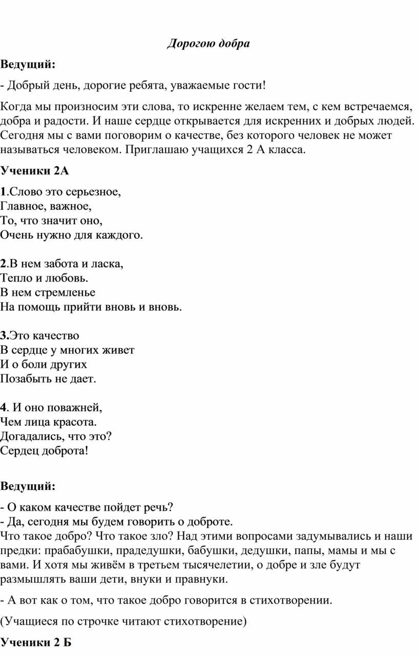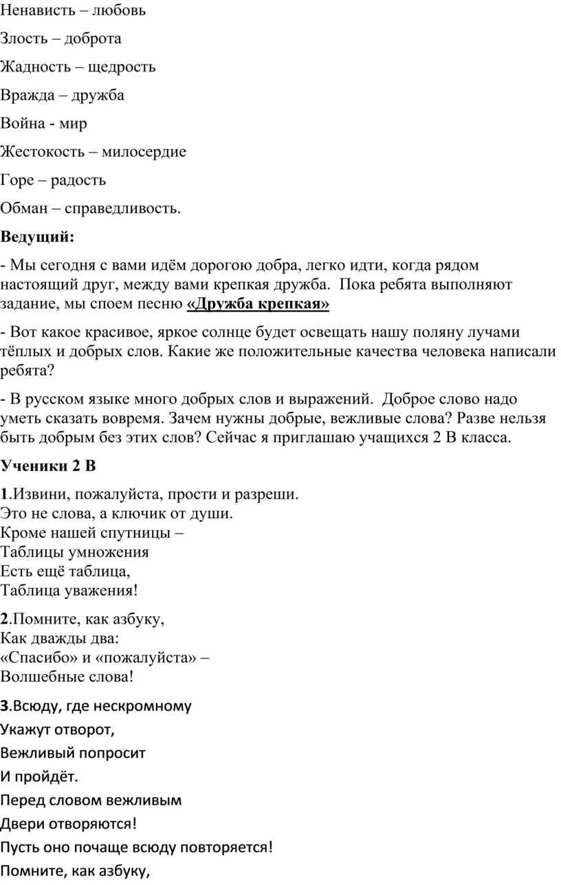 - В русском языке много добрых слов и выражений. Доброе слово надо уметь сказать вовремя. Зачем нужны добрые, вежливые слова? Разве нельзя быть добрым без этих слов? Сейчас я приглашаю учащихся 2 В класса.