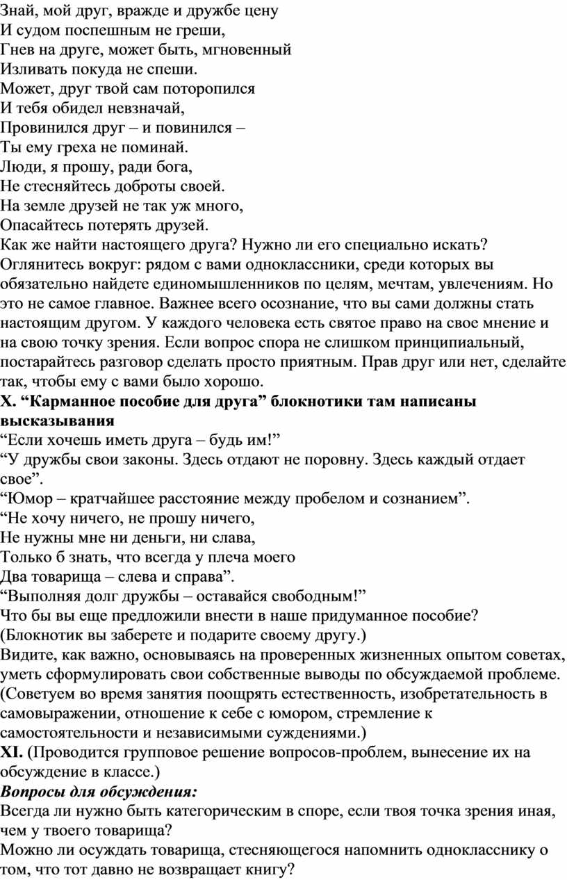 VIII. Умение дружить – качество, которым обладает не каждый. Хорошего друга ценят, им дорожат, и такой человек редко бывает одинок. А ты умеешь дружить? (Предлагается тест из модного юношеского журнала “Gool”.)