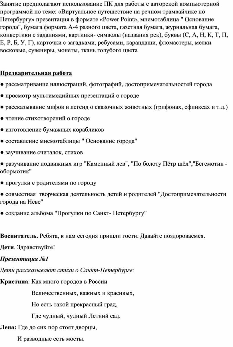 Занятие предполагают использование ПК для работы с авторской компьютерной программой по теме: «Виртуальное путешествие на речном трамвайчике по Петербургу» презентация в формате «Power Point», мнемотаблица " Основание города", бумага формата А-4 разного цвета, газетная бумага, журнальная бумага, конвертики с заданиями, картинки- символы (названия рек), буквы (С, А, Н, К, Т, П, Е, Р, Б, У, Г), карточки с загадками, ребусами, карандаши, фломастеры, мелки восковые, сувениры, монеты, ткань голубого цвета