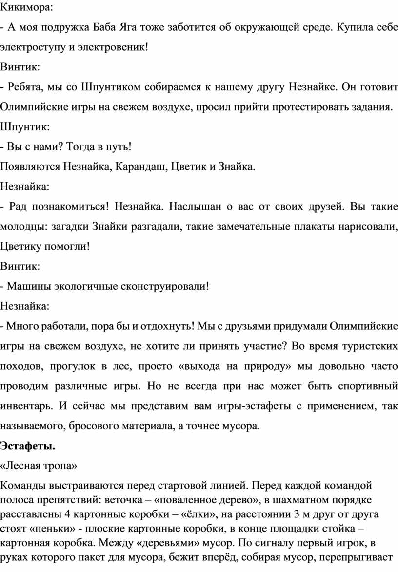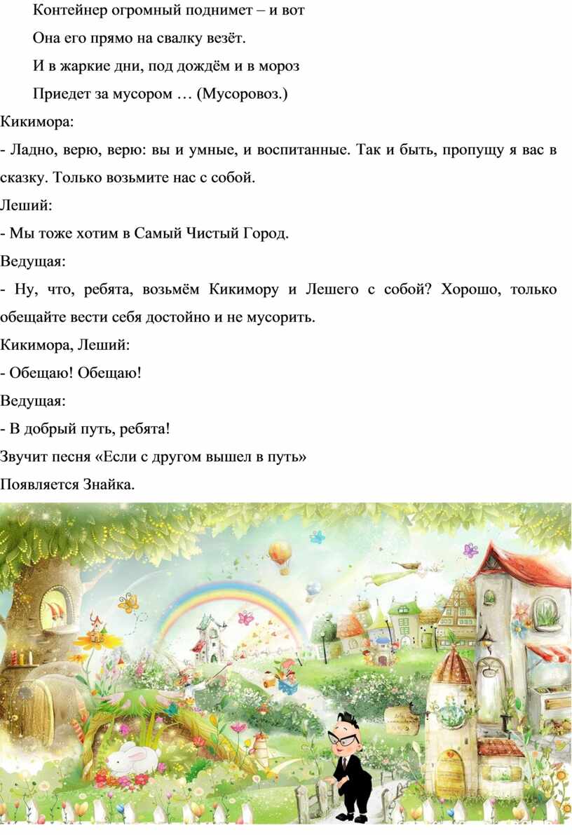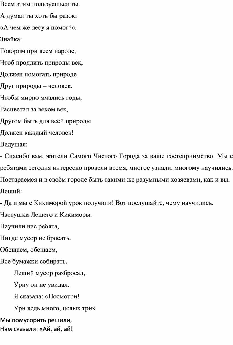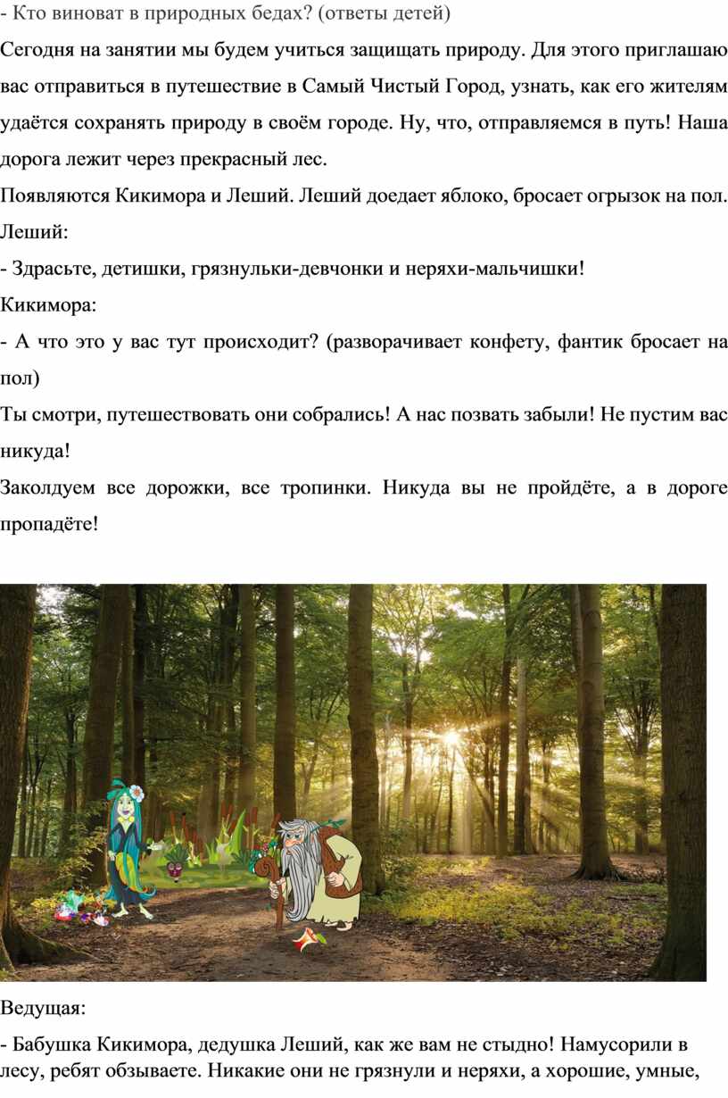 - Бабушка Кикимора, дедушка Леший, как же вам не стыдно! Намусорили в лесу, ребят обзываете. Никакие они не грязнули и неряхи, а хорошие, умные, воспитанные дети. Перестаньте, пожалуйста, вредничать да пропустите нас в сказочную страну.