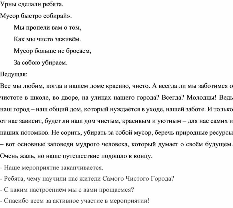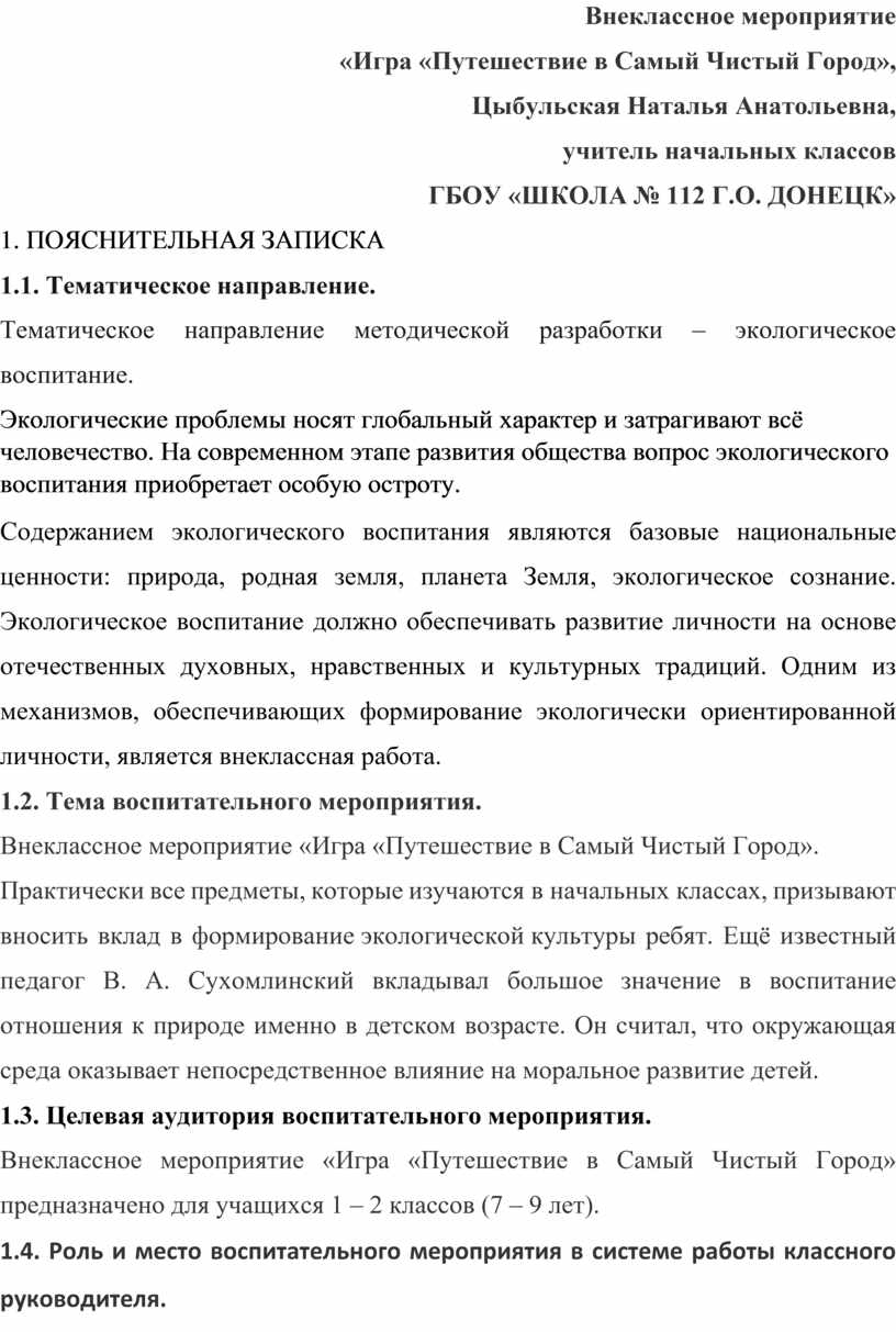 Внеклассное мероприятие «Игра «Путешествие в Самый Чистый Город» можно провести в рамках Экологической недели в школе, на каникулах, как воспитательное мероприятие или в пришкольном лагере.