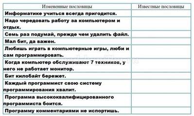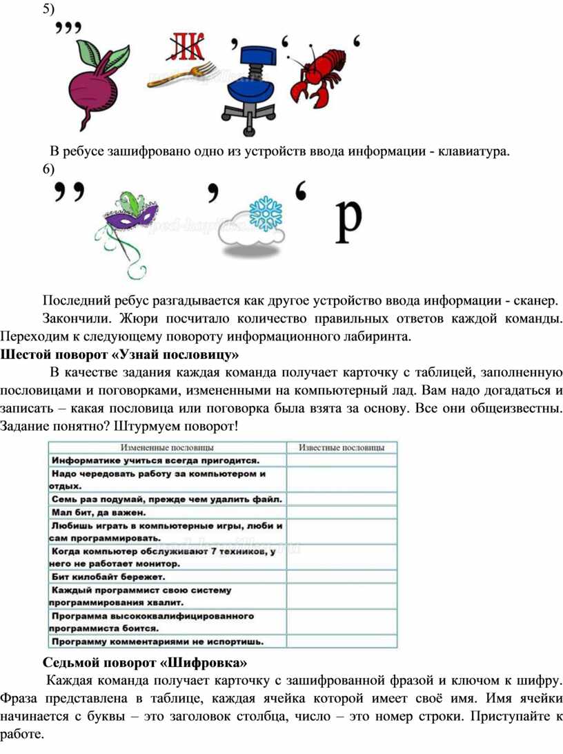 В качестве задания каждая команда получает карточку с таблицей, заполненную пословицами и поговорками, измененными на компьютерный лад. Вам надо догадаться и записать – какая пословица или поговорка была взята за основу. Все они общеизвестны. Задание понятно? Штурмуем поворот!