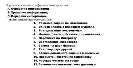 К основным информационным процессам относятся обработка, хранение, прием и передача информации. Последние два действия, прием и передача, в карточке объединено одним – передачей информации. Начинаем работу.