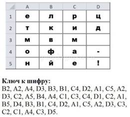 Каждая команда получает карточку с зашифрованной фразой и ключом к шифру. Фраза представлена в таблице, каждая ячейка которой имеет своё имя. Имя ячейки начинается с буквы – это заголовок столбца, число – это номер строки. Приступайте к работе.