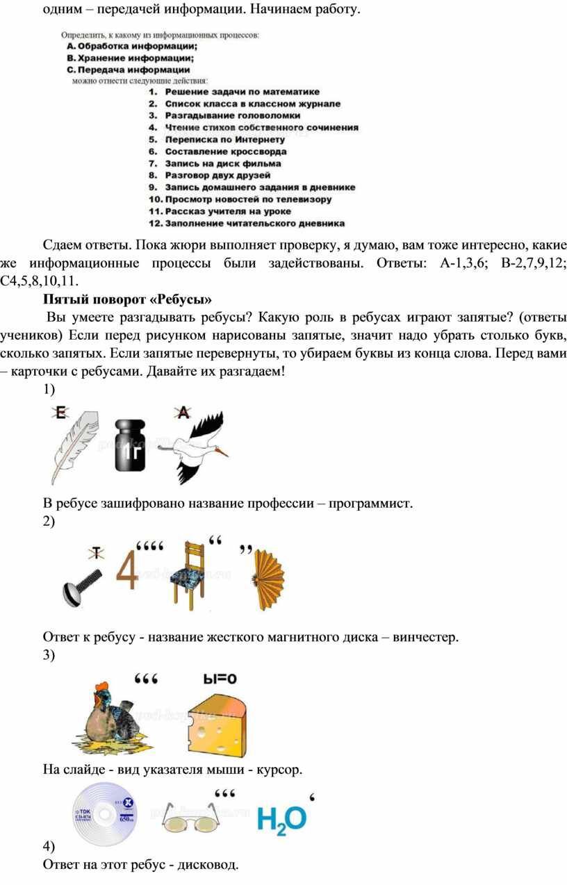 Закончили – сдаем ответы жюри. Давайте себя проверим. Правильные ответы – компьютер, файл, сканер, монитор, драйвер. Надеюсь, никто из вас не попал в тупик информационного лабиринта? Идем дальше.