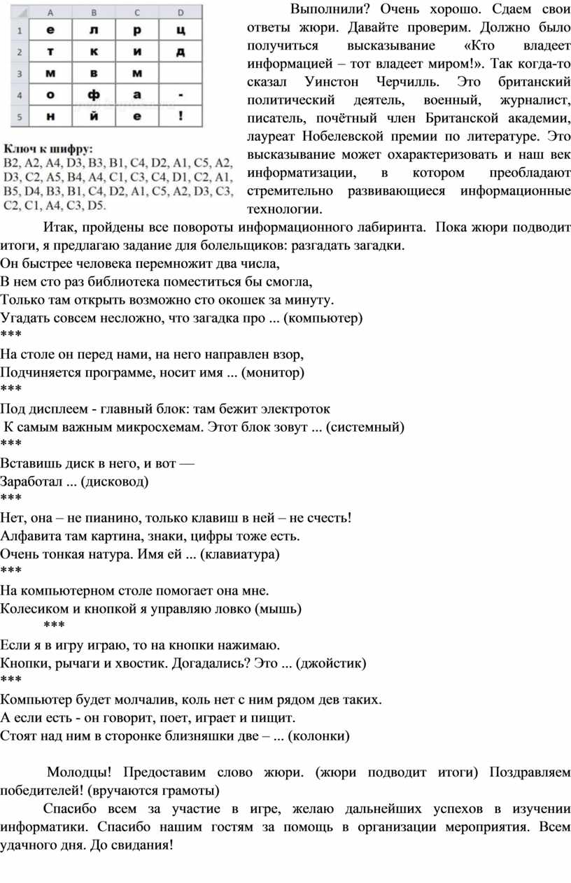 Итак, пройдены все повороты информационного лабиринта. Пока жюри подводит итоги, я предлагаю задание для болельщиков: разгадать загадки.