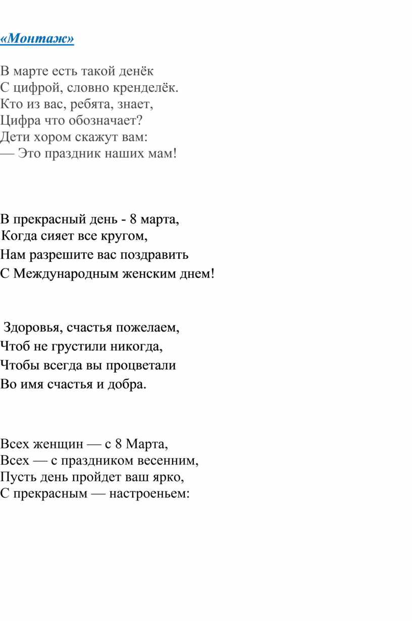 Разрешите поздравить всех с первым весенним праздником – 8 Марта. Пожелать добра, радости, яркого весеннего солнца, исполнения всех желаний. В нашей стране этот день давно уже превратился в весёлый, шуточный, весенний праздник. Все с нетерпением ждут 8 Марта, но не потому, что мечтают о дорогих подарках, а потому, что это – день сюрпризов. Сюрприз подготовили для всех нас и наши дети.