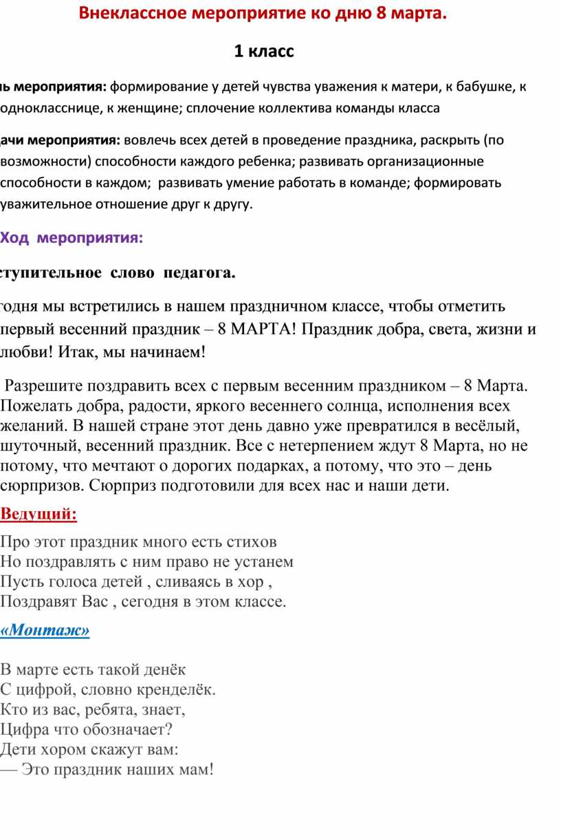Цель мероприятия: формирование у детей чувства уважения к матери, к бабушке, к однокласснице, к женщине; сплочение коллектива команды класса